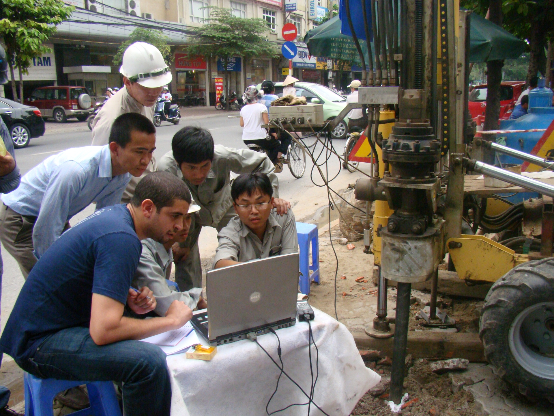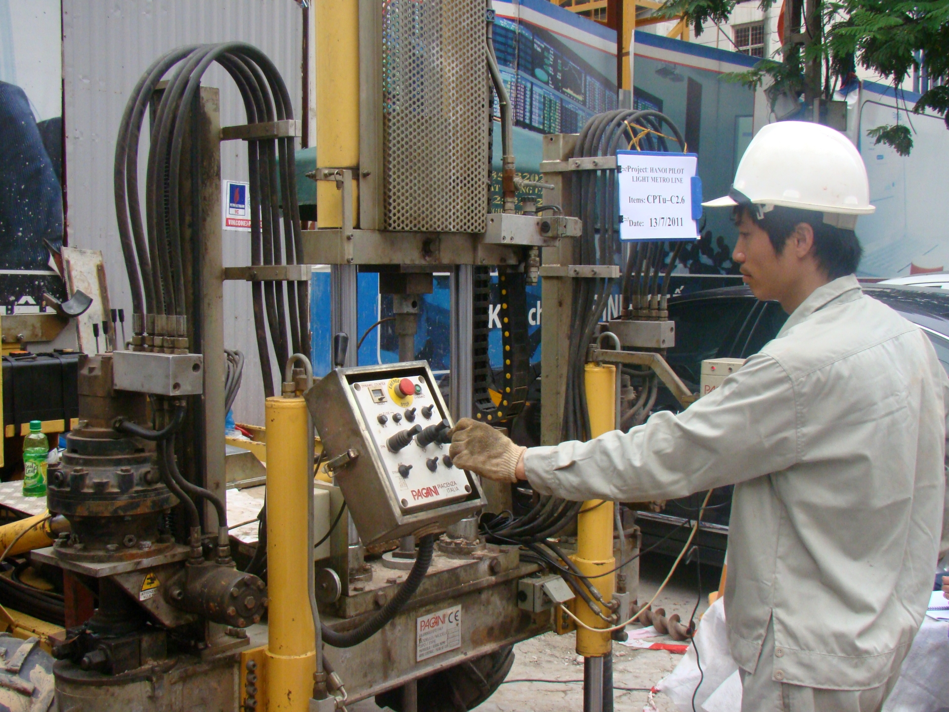 Chuyên gia tư vấn giám sát Systra Cộng hòa Pháp đang kiểm tra mẫu đất, đá do USCo khoan khảo sát và thí nghiệm của Dự án tuyến tàu điện ngầm Nhổn - ga Hà Nội.
