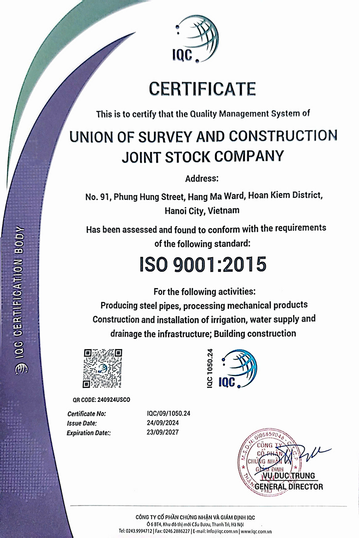 Ngày 24/9/2024 Công ty Cổ phần Khảo sát và xây dựng- USCO được cấp Chứng nhận quản lý chất lượng ISO 9001-2015 bởi Công ty Cổ phần chứng nhận và giám định IQC.