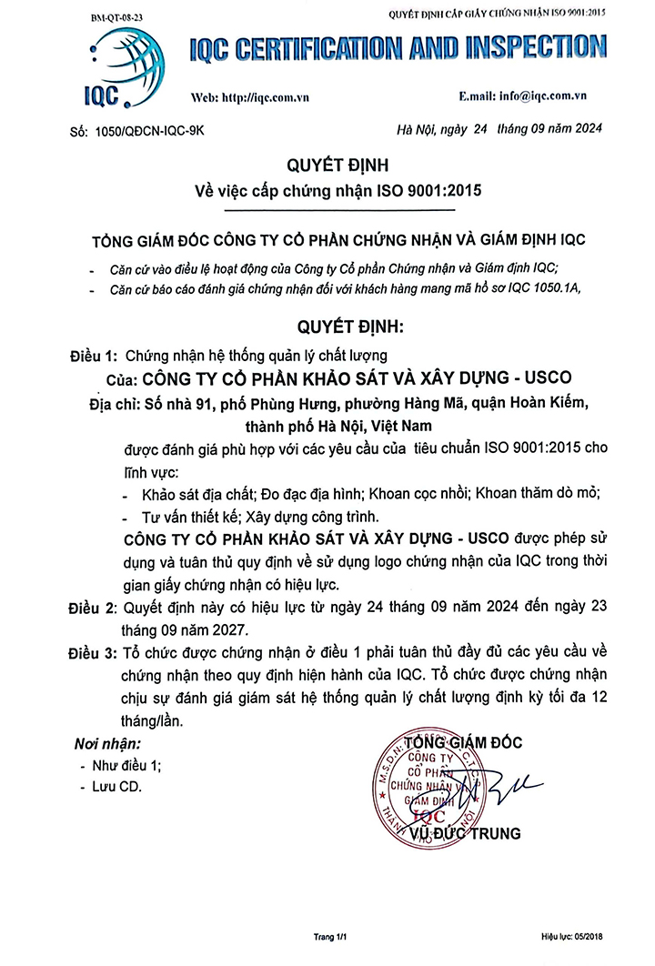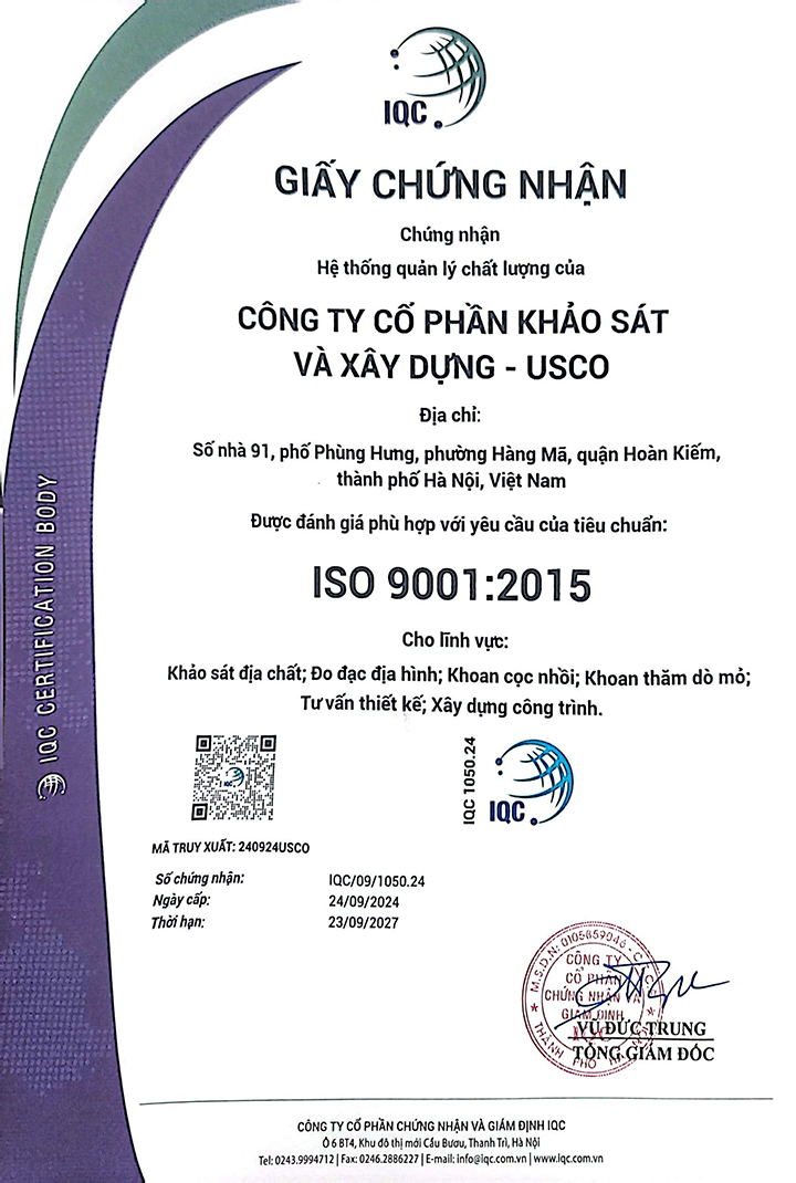 Giấy chứng nhận hệ thống quản lý chất lượng ISO 9001: 2015 được cấp cho USCO trong các lĩnh vực hoạt động: khảo sát địa chất, đo đạc địa hình, khoan cọc nhồi, khoan thăm dò mỏ, tư vấn thiết kế, xây dựng công trình.